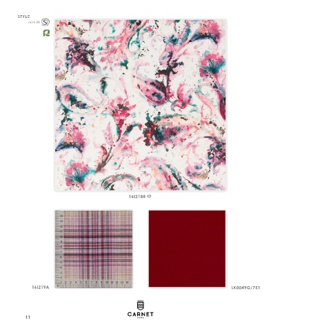 STYL E pure silk STAMPA SU SATIN DI SETA PRINTED SILK SATIN 100%SE h 138 cm • 94 gr 16I218R CAPPOTTO CHECK COAT 97%WV 2%EA 1%PA 90%WO 10%WS 16I219A h 150 cm • 300 gr h 150 cm • 600 gr LK0049G/751 11