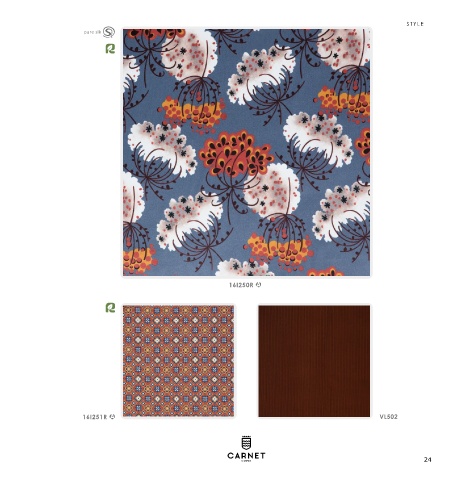 STYL E pure silk STAMPA SU SATIN DI SETA PRINTED SILK SATIN 100%SE h 138 cm • 94 gr 16I250R STAMPA SU TWILL DI COTONE VELLUTO 500 RIGHE PRINTED COTTON TWILL 500 LINES VELVET 100%CO 100%CO 16I251R h 140 cm • 130 gr h 145 cm • 370 gr VL502 24