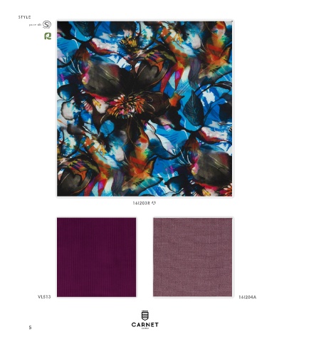 STYL E pure silk STAMPA SU CRÊPE DE CHINE DI SETA PRINTED SILK CRÊPE DE CHINE 100%SE h 130 cm • 100 gr 16I203R VELLUTO 500 RIGHE 500 LINES VELVET PIED DE POULE 100%CO 98%WV 2%EA VL513 h 145 cm • 370 gr h 150 cm • 300 gr 16I204A 5