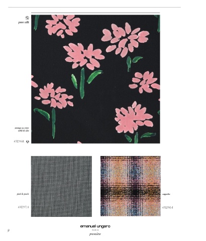 pure silk stampa su crêpe sablé di seta 100%SE 65I216R H 140 cm - P. 127 gr pied de poule cappotto 95%WV 5%EA 43%WV 27%PA 20%SE 5%WP 5%WM 65I217A H 150 cm - P. 330 gr H 145 cm - P. 620 gr 65I218A 9