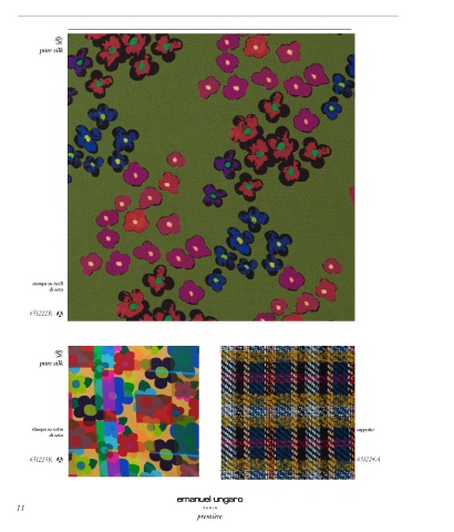 pure silk stampa su twill di seta 100%SE 65I222R H 140 cm - P. 100 gr pure silk stampa su satin cappotto di seta 100%SE 69%WO 12%WV 10%WM 9%PA 65I223R H 140 cm - P. 100 gr H 150 cm - P. 673 gr 65I224A 11