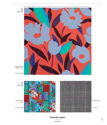 pure silk stampa su doppia georgette di seta 100%SE 65I249R H 140 cm - P. 128 gr pure silk stampa su satin principe di galles di seta 100%SE 95%WV 5%EA 65I250R H 140 cm - P. 100 gr H 150 cm - P. 330 gr 65I251A 20