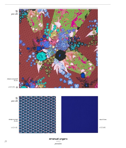 pure silk stampa su jacquard di seta 100%SE 65I252R H 145 cm - P. 99 gr pure silk stampa su pongé crêpe di lana di seta 100%SE 100%WO 65I253R H 140 cm - P. 72 gr H 145 cm - P. 344 gr 65I254R 21