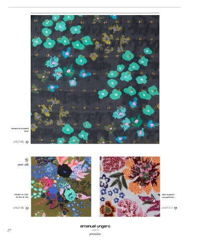 stampa su jacquard lamé 98%SE 1%PA 1%ME 65I270R H 127 cm - P. 53 gr pure silk stampa su crêpe tulle ricamato di rasodi seta con paillettes 100%SE 100%PL 65I271R H 140 cm - P. 91 gr H 125 cm - P. 376 gr 65I272A 27